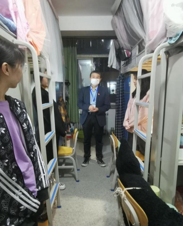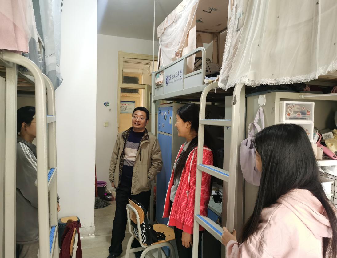 在疫情最吃紧的阶段,新葡的京集团8814登录入口院长梁旺兵和学院党委副书记戴小武多次走访学生宿舍,确保所有同学遵守校园疫情防控规定全部安全在校。走访过程中,梁老师与戴老师针对毕业班同学在考研复试、线上招聘等过程中遇到的诸多问题,耐心解答学生疑惑,缓解学生就业压力,充分做好思想引导工作。